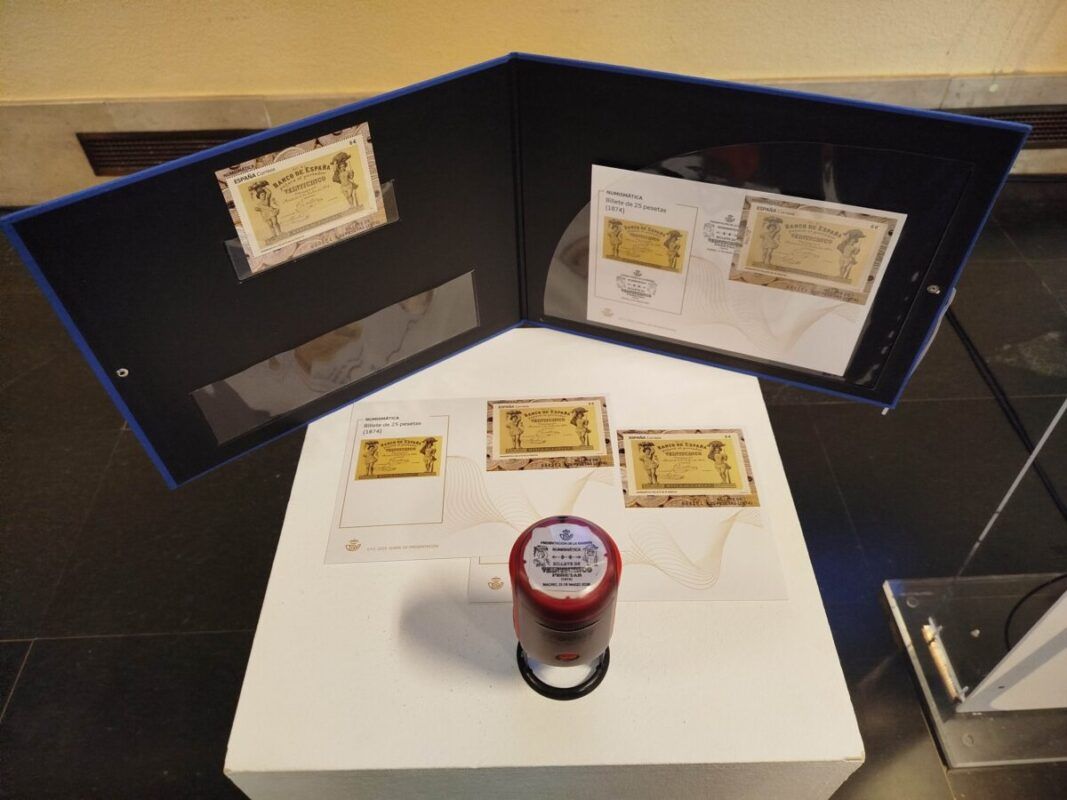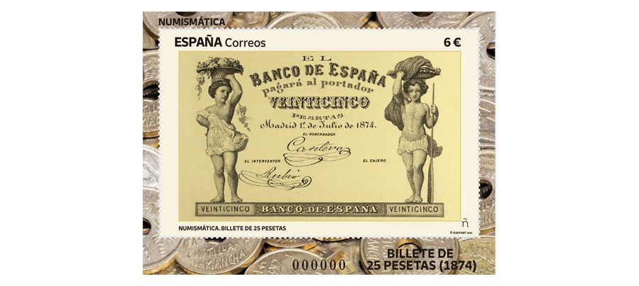 Presentación sello «Numismática. Billete de 25 pesetas (1874)»