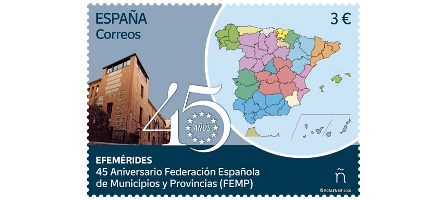 A lo largo de este año, la FEMP conmemora su 45º aniversario con la celebración de jornadas, actos culturales y deportivos, la emisión de este sello de Correos, de una moneda conmemorativa y la celebración de sorteos.