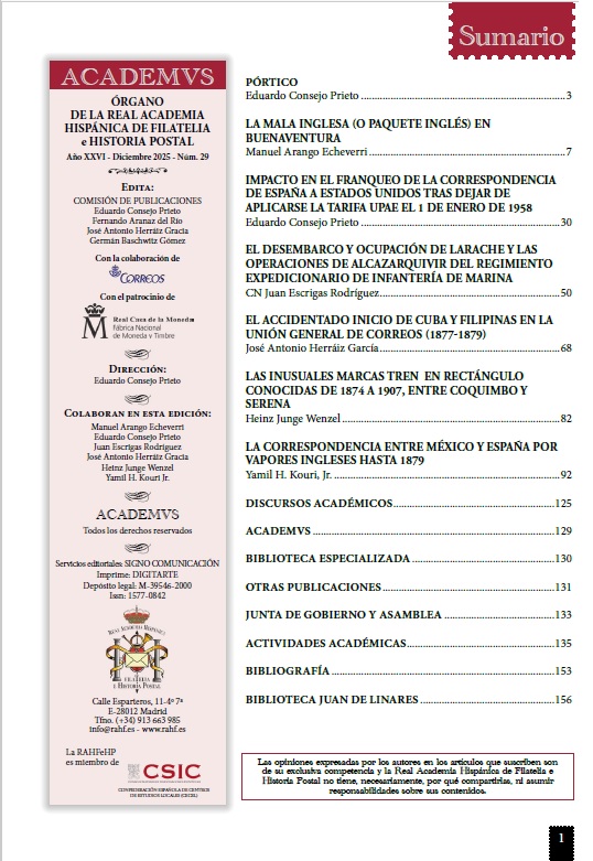 Este número comienza con un Pórtico redactado por el Sr. Presidente en el que se da a conocer el buen estado de incorporación de Académicos de Número, Electos y Correspondientes y ofrece un pequeño repaso de algunas de las actuaciones que se han realizado este año, como son la celebración de varias Sesiones Académicas (Madrid, Uruguay y Cádiz), las nuevas publicaciones, las buenas relaciones con CORREOS, FNMT-RCM y AISP, así como la continuación de diversas colaboraciones.