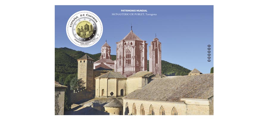 Para la hoja bloque calcográfica se ha escogido una vista de la zona este del monasterio en la que se ven los ábsides de la iglesia del siglo XII, el gran dormitorio del siglo XIII y la muralla del siglo XIV que rodea el monasterio.