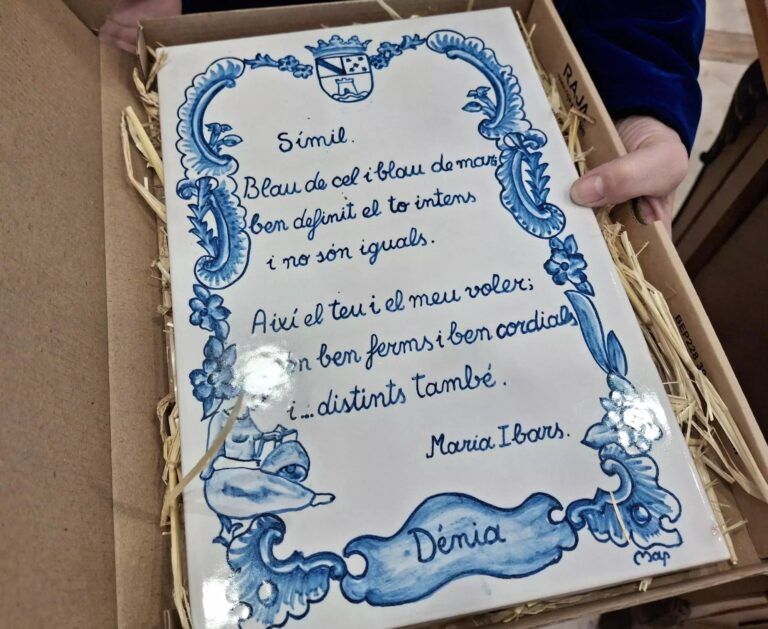 El acto prosiguió con el matasellado oficial de “Presentación”, y el intercambio de obsequios tanto por parte de Correos al Ayuntamiento y al IECMA, así como al Académico Correspondiente de la RAHFeHP, Ivars, promotor de esta iniciativa, como del Ayuntamiento que hizo entrega a Lera e Ivars de sendas losetas con un verso de los muchos que María Ibars compuso en su dilatada trayectoria como escritora.