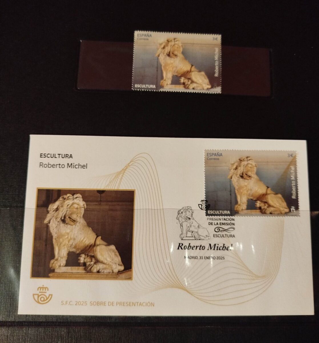 El pasado martes, 4 de febrero de 2025, tuvo lugar en la Fábrica Nacional de Moneda y Timbre – Real Casa de la Moneda, en Madrid, la presentación del sello “Escultura. Roberto Michel”, que corrió a cargo conjuntamente de Correos, Patrimonio Nacional y la Fundación Real Casa de la Moneda, representados respectivamente por Dña. Nuria Lera (Directora de Filatelia y Relaciones Institucionales de Correos), D. Victor Cageao (Director de las Colecciones Reales de Patrimonio Nacional) y D. Rafael Feria (Director de la Fundación Real Casa de la Moneda).