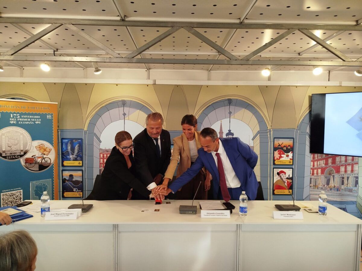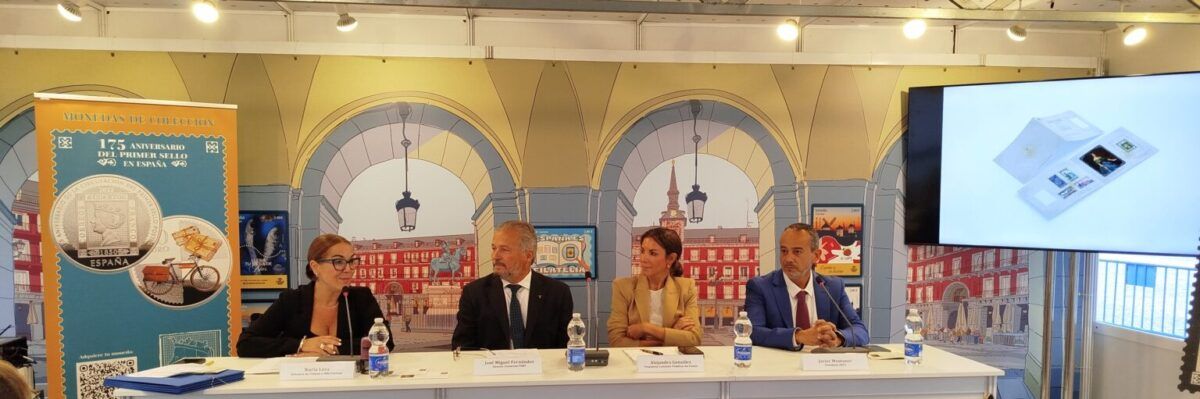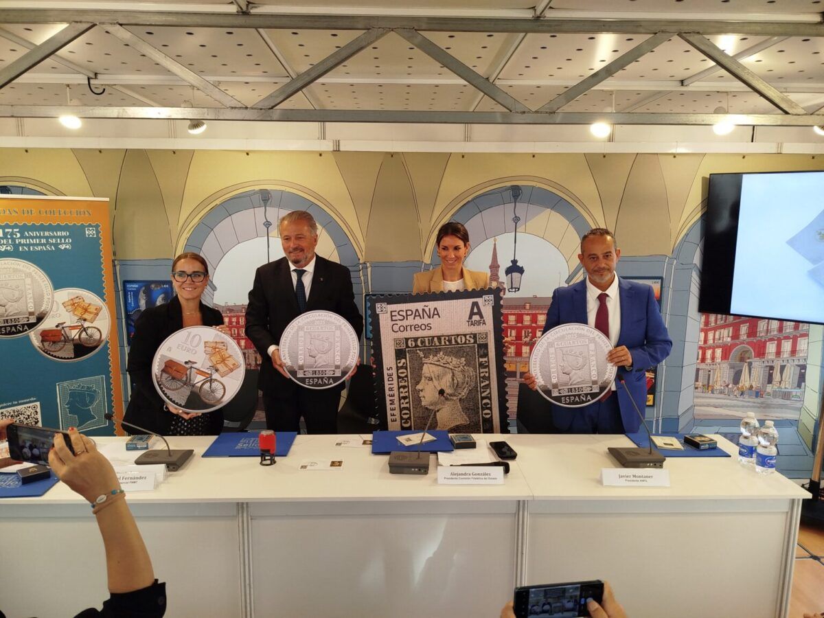 El pasado jueves, 25 de septiembre de 2025, tuvo lugar en la Plaza Mayor de Madrid la presentación del sello y la moneda conmemorativa “175 años del primer sello de Correos en España”, coincidiendo con el acto de inauguración de la 55ª Feria Nacional del Sello.