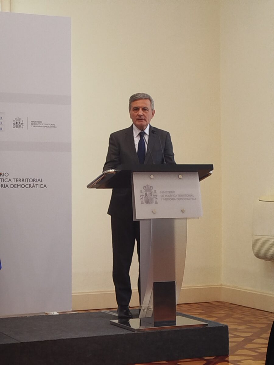 A continuación tuvo lugar el matasellado de honor y el posado con las carpetas conmemorativas y la reproducción del sello a gran tamaño, uniéndose para las fotos Dña. Nuria Lera Hervás, Directora de Filatelia y Relaciones Institucionales de Correos; Dña. Berta Pérez Hernández, Subsecretaria de Política Territorial y Memoria Democrática; D. Fernando Martínez López, Secretario de Estado de Memoria Democrática; D. Arcadi España García, Secretario de Estado de Política Territorial y Dña. Miryam Álvarez Páez, Secretaria General de Coordinación Territorial.